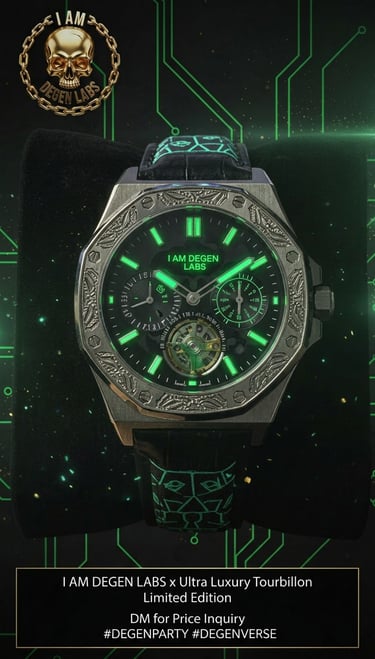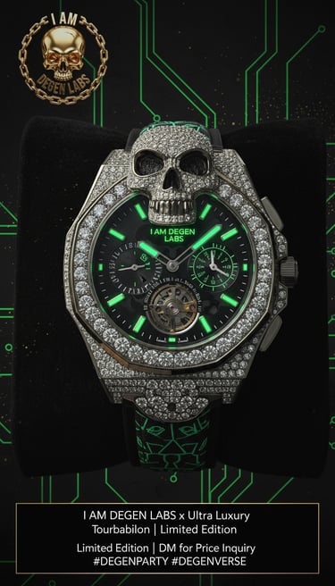 Entry to I AM DEGEN LABS luxury: 42mm case, skeleton dial revealing precision mechanics, forged for the original degens. (~€250,000 | Limited to 100 pcs).